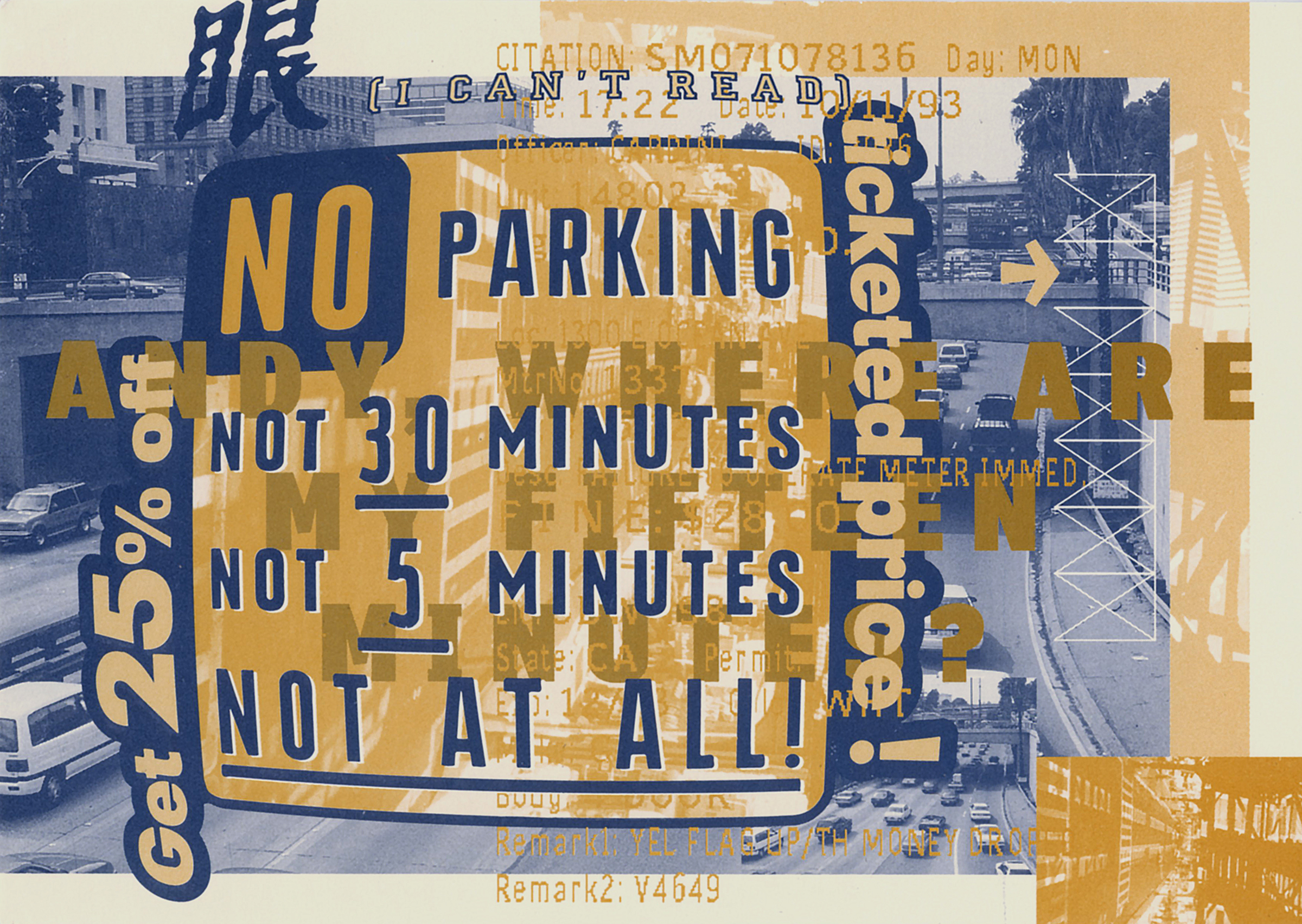 I visited the US for the first time in those years. I visited New York, Boston, Seattle, San Francisco, Los Angeles and Boulder and was fascinated by the verbose street signs and the shameless advertising slogans. In hindsight, these cards display cultural naïveté, linguistic ignorance and an obsession with postmodern theory and the layering language known from Cranbrook and CalArts.